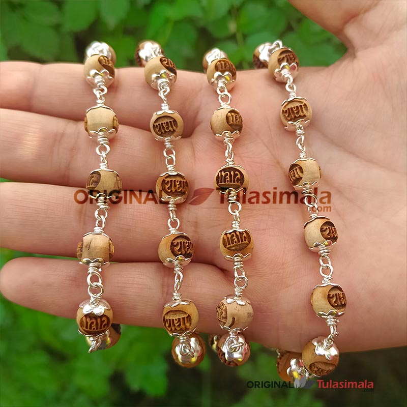 54+1 Beads Shri Radha Name Design Original Tulsi Japa Mala in Pure Silver 8mm Size and 84 Centimeter Length Mala, For God Statue tulsi Mala, Japa Meditation Tulsi Mala, and Neck Silver Tulsi Mala